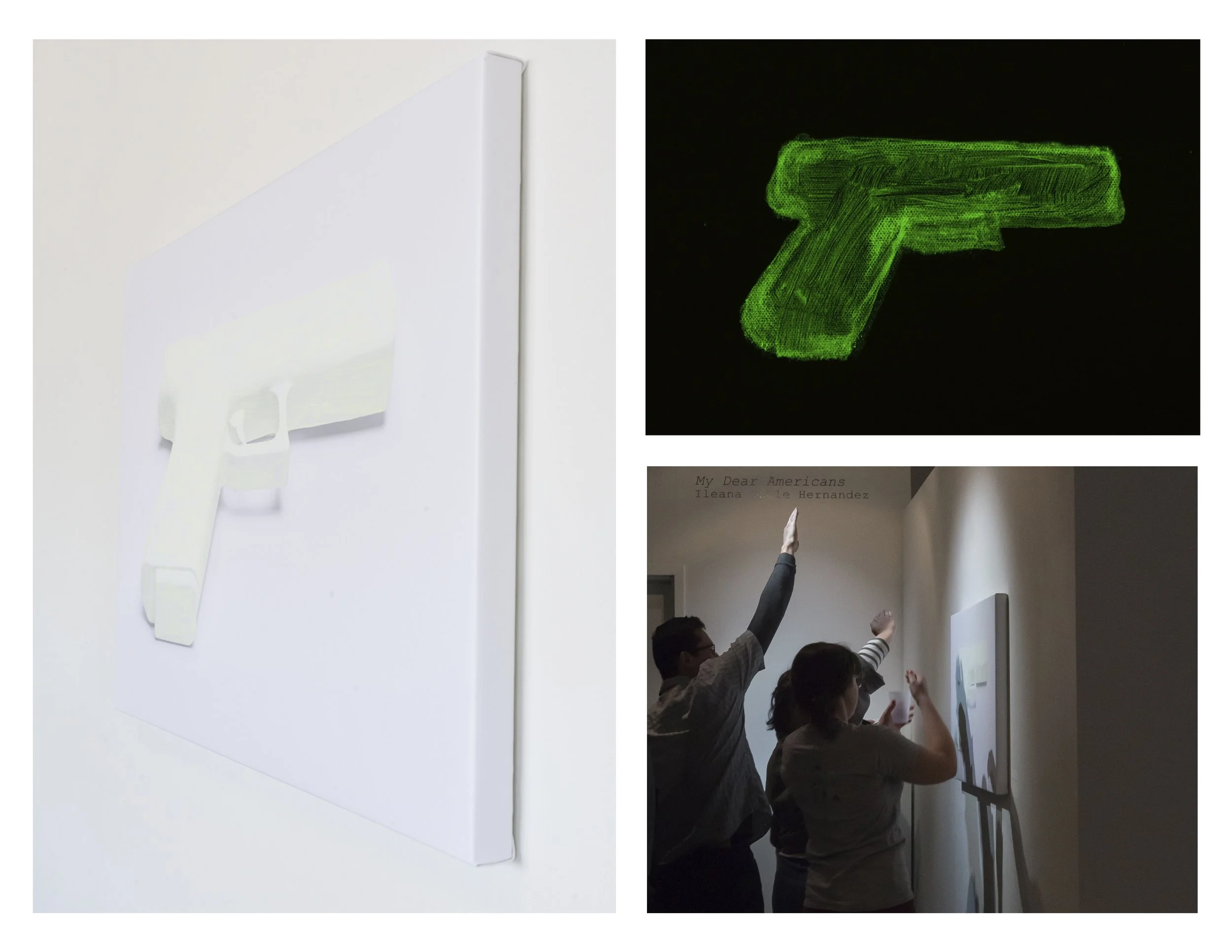 In “Extreme White” (2018), a 36 x 24 print on canvas, a white gun is photographed on a white background, which leaves little distinction between where the gun stops and where the white background begins. However, the object resists completely blending into its environment, as it dominates most of the frame and feels heavy. The gun has been painted with glow-in-the-dark paint, making the white background black and the gun electric green when the lights are off. When installed in an exhibition, the piece is labeled so that the materials used are available for the viewers to recognize, however viewers are unable to experience the work in darkness because the glow-in-the- dark paint is blocked by the gallery lights. The intention of this work is to offer the viewer the opportunity to scrutinize white privilege. “Extreme White” (2018) is a piece that might look obvious and simple, but it is also a piece in which the viewers are blocked the opportunity to appreciate all the characteristics it offers. By not allowing viewers to see how the work transforms but letting them know that it does, I give them a disadvantage, and trigger the audience to think about how white privilege feels like.